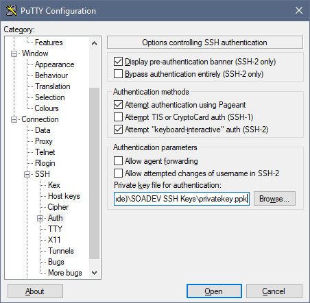 .ppkfile to configure a new PuTTY session. - When configuring a new session in PuTTY, navigate to Connection > SSH > Auth and enter the location of your private key