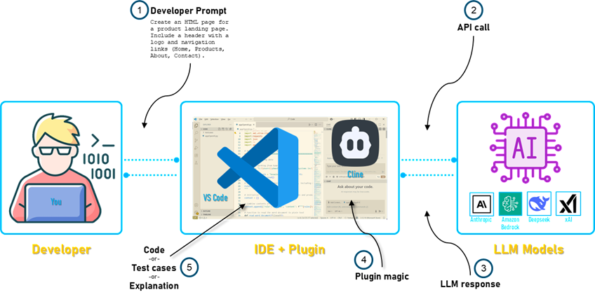 First, the developer enters a prompt using natural language to a plugin within the IDE. This could be a simple "Create an HTML-based calculator application." The plugin makes an API call to a provider's model (you choose the provider and model), usually at a cost per call. The response is returned by the model. The response could be informational or instruct the plugin to begin manipulating your local code for you (i.e., operating as an "agent").