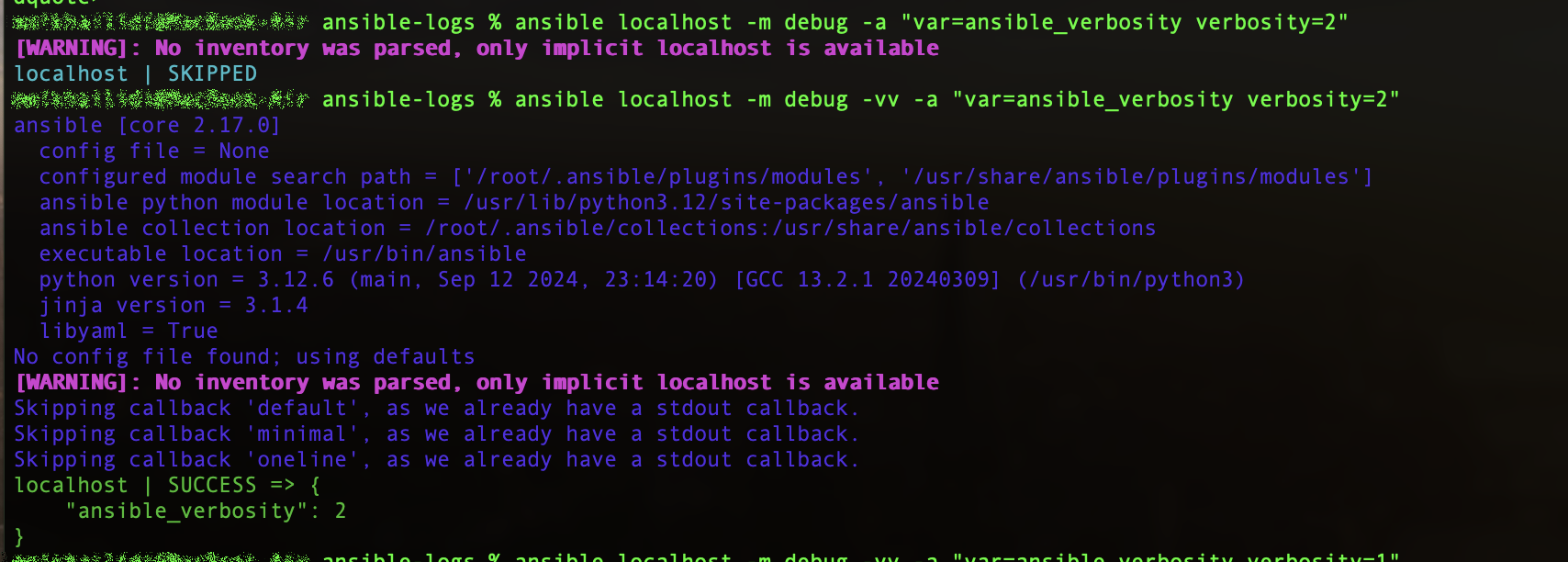$ ansible-playbook -i hosts.yml -vvv ansible-logs.yml Executing Ansible playbook with the debugging verbosity level.