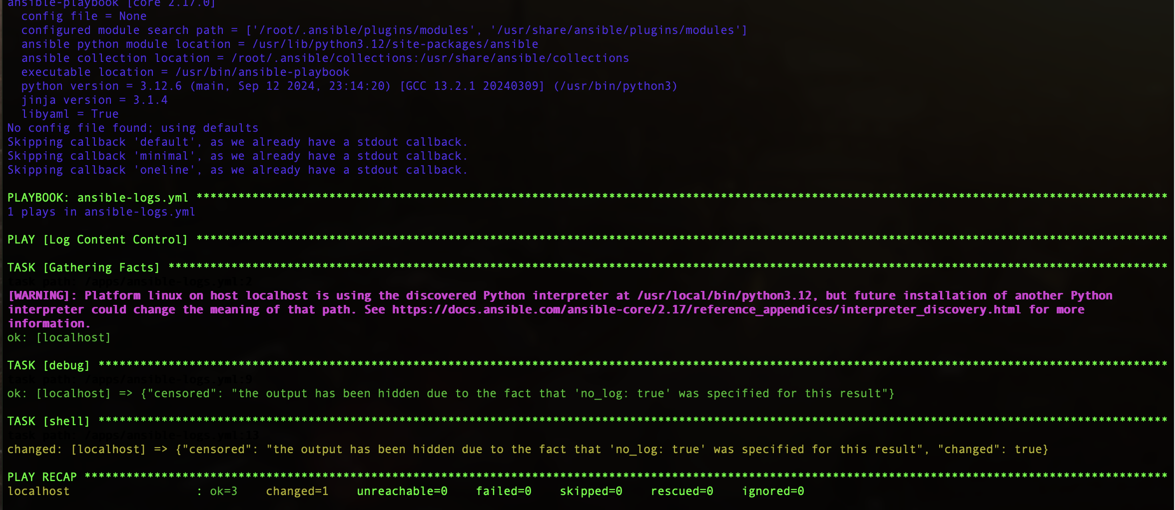 The attribute accepts a boolean value, and if set to True, Ansible does not record command output. The screenshot below depicts task messages when no_log is active.