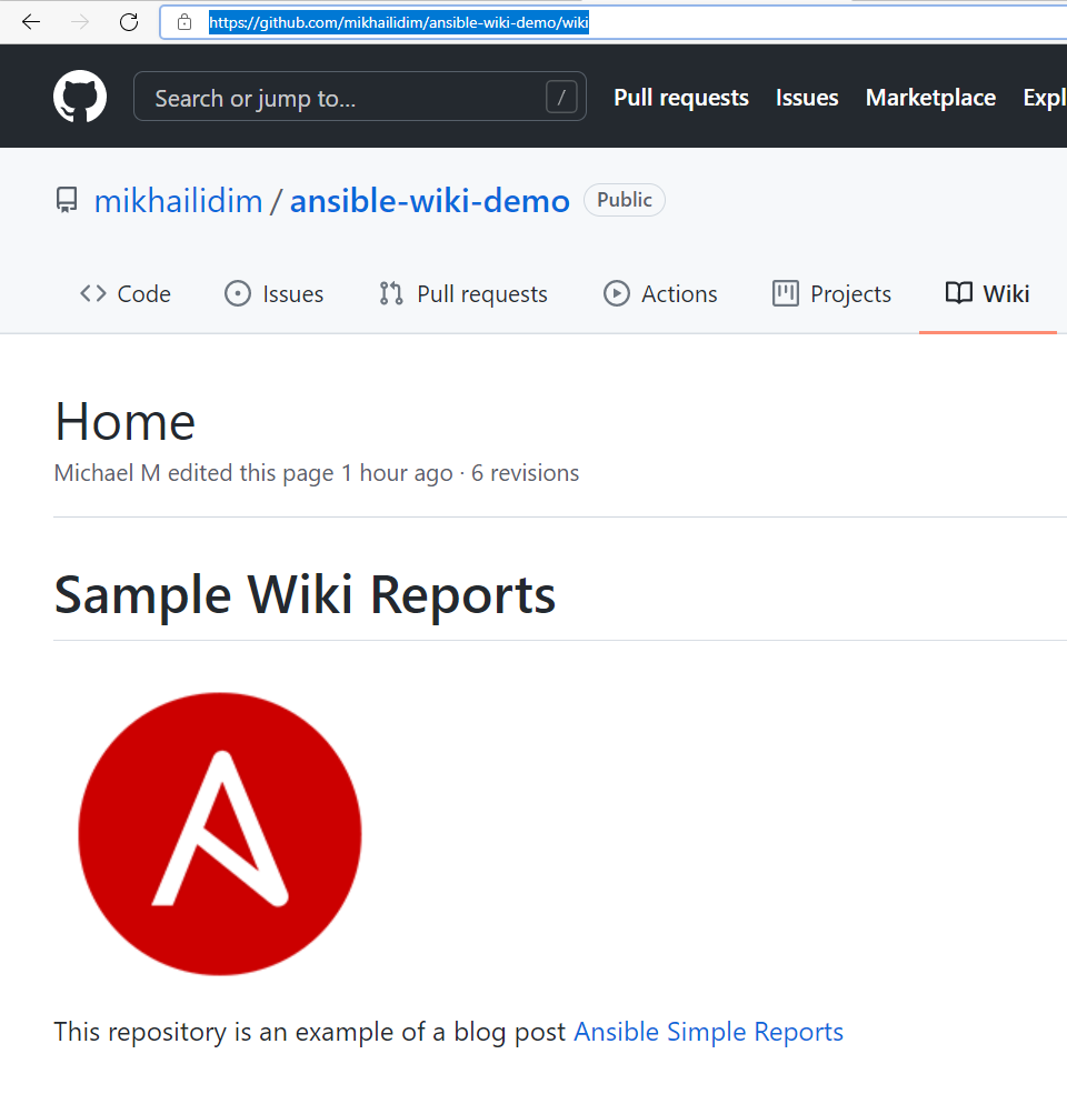 - Sample code refers to the sample Wiki repository - ansible-wiki-demo. Feel free to fork it or use your own. In any case, do not forget to update the repository URL in the code.