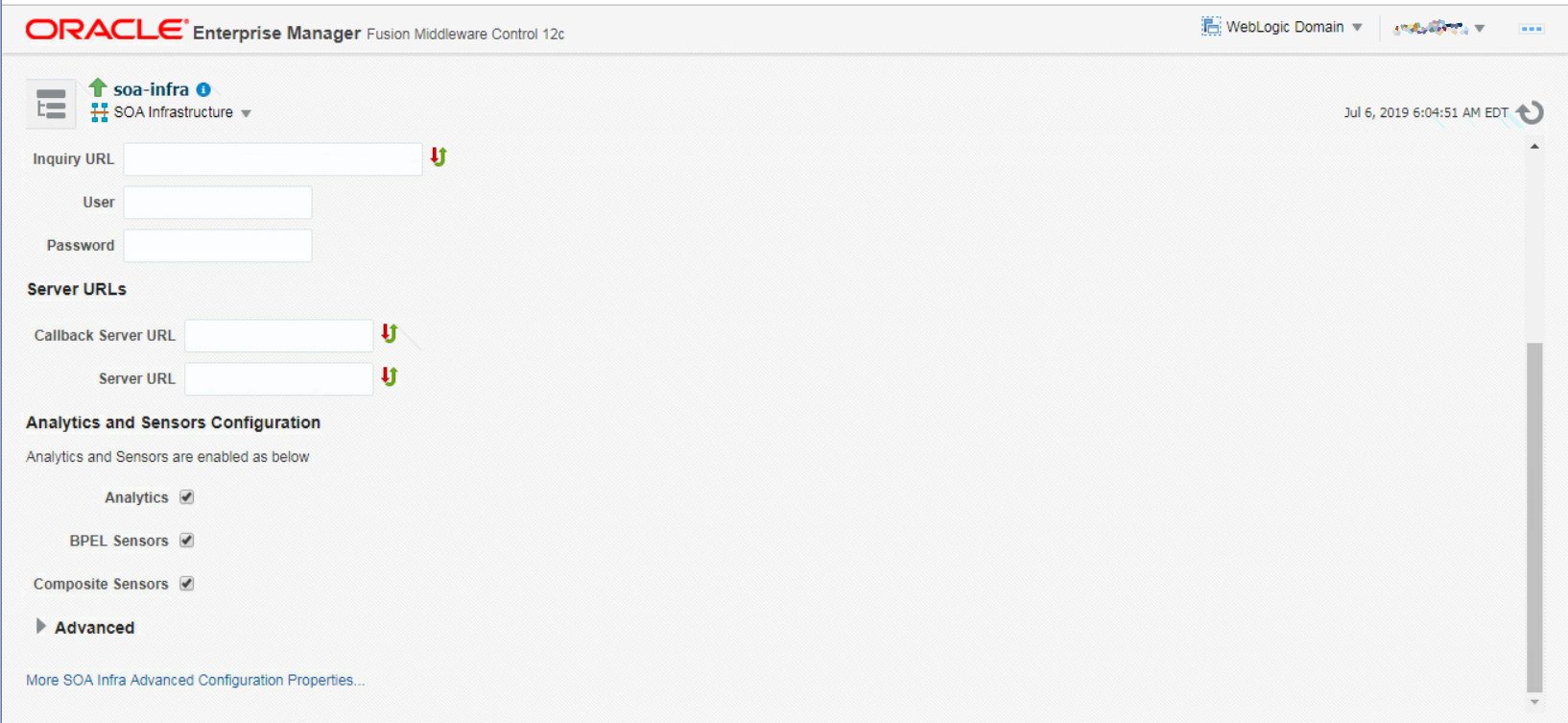 An essential part of the SOA Suite configuration is setting your server and callback URLs, especially, if your SOA server is behind a reverse proxy or load balancer. Oracle provides the only way to configure those properties: Oracle Enterprise Manager Fusion Middleware Control (see Figure 1).