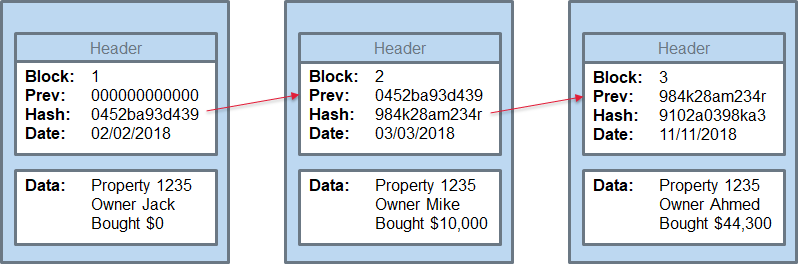 Each of these blocks are linked together by the previous blocks' hash, creating a chain.
