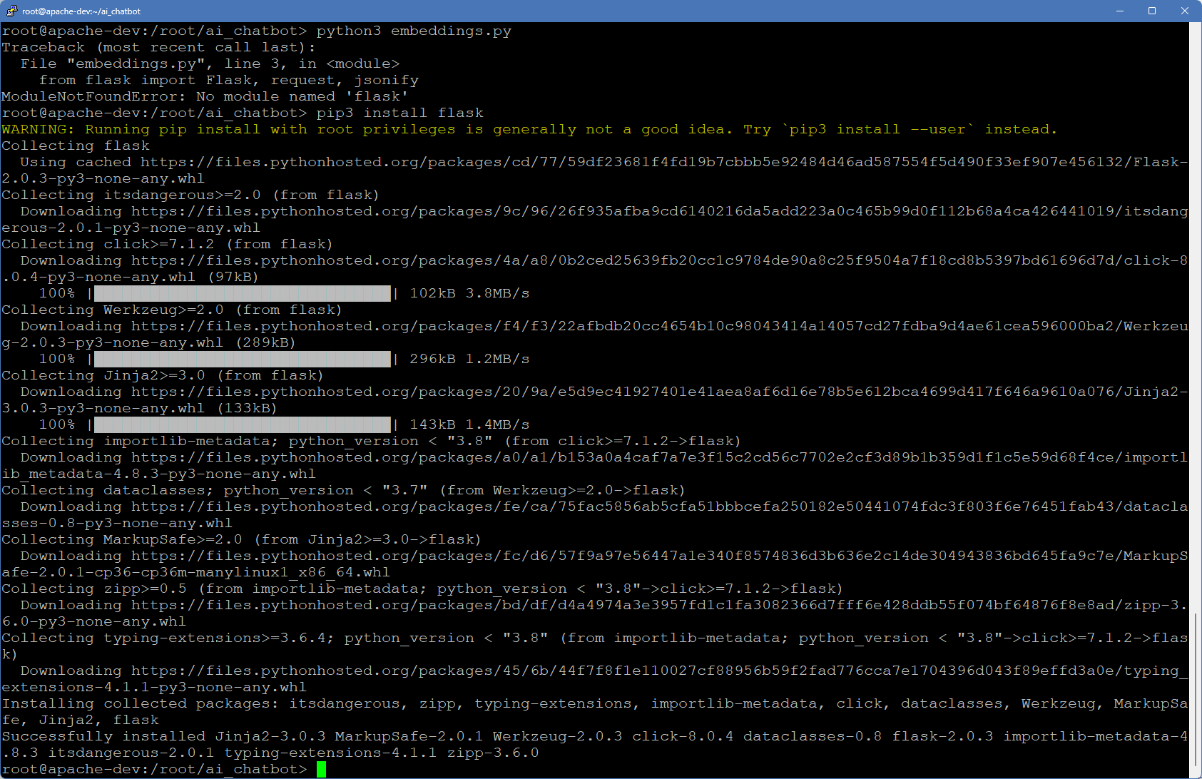 pip3 install langchain flask llama_index gradio openai pandas numpy glob2 datetimeAs you can see, flask is included.
