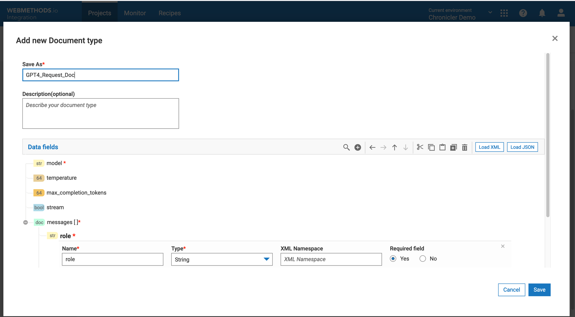 - Set the document type name, i.e., "GPT4_Request_Doc," and save the new document type.
