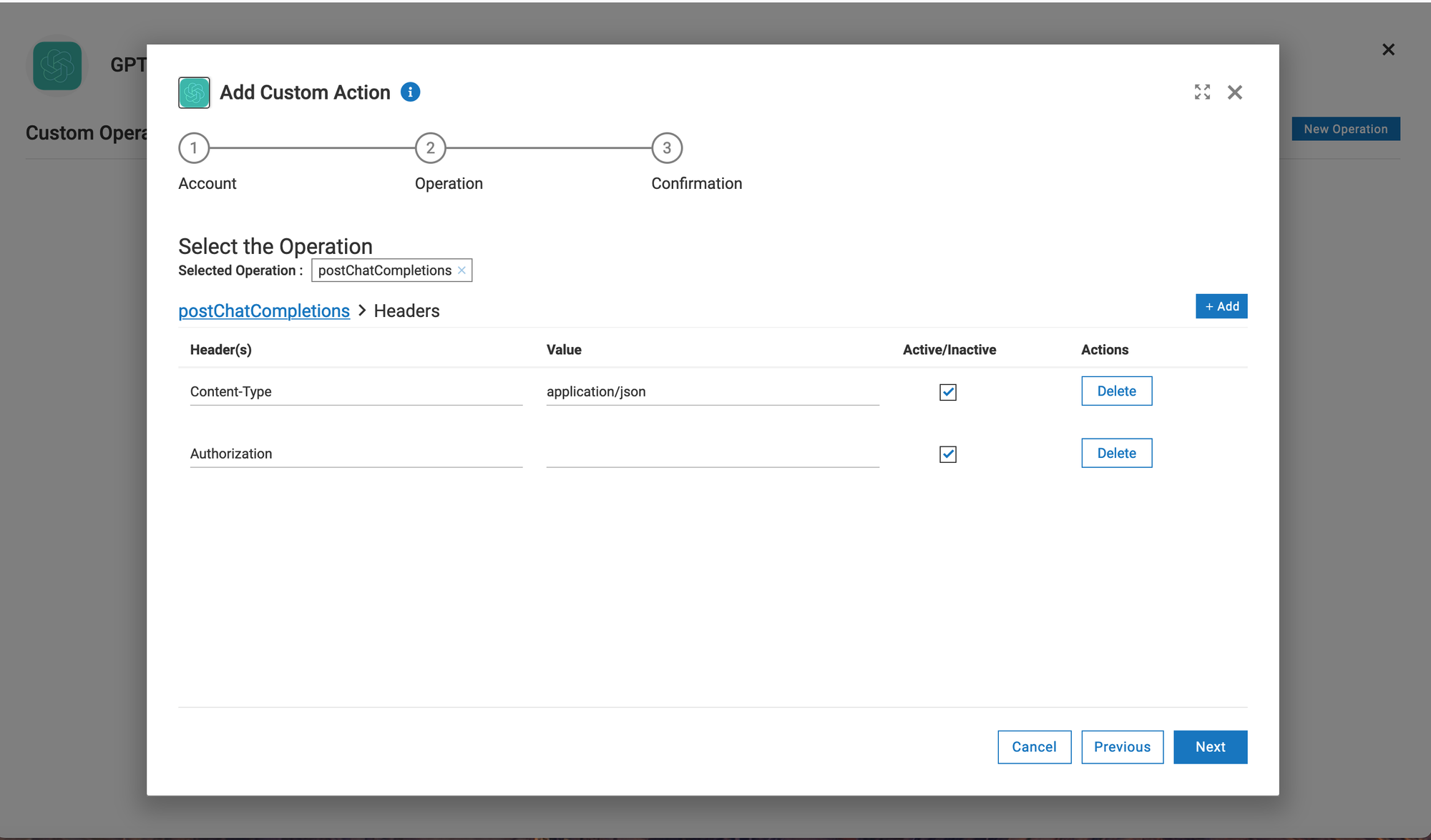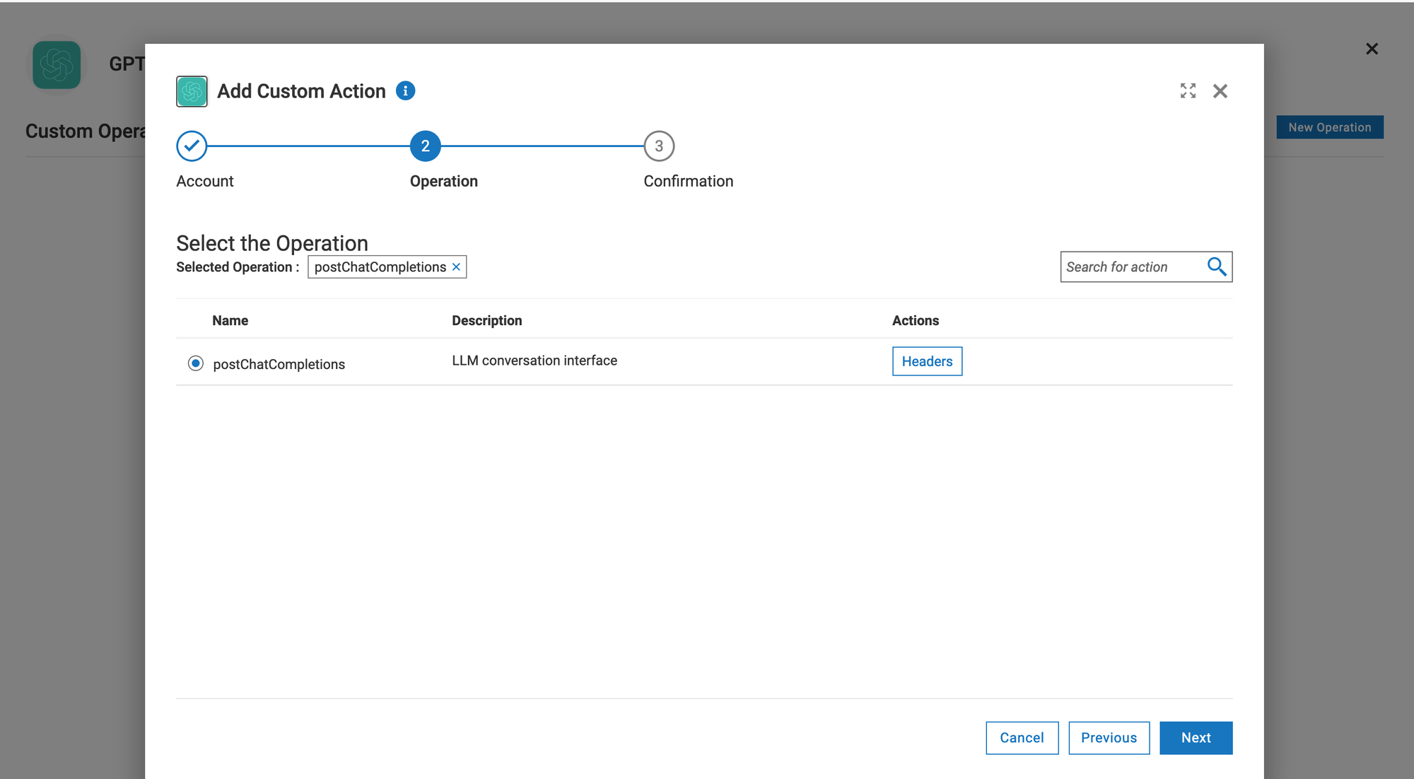 - Activate the radio button against the "postChatCompletions" and click on the "Headers" button.