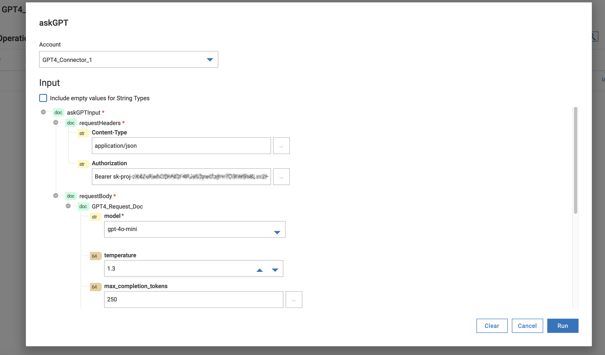 - Select the connection account and fill out the input fields. It's important to set the Authorization header value to "Bearer ${Your API Key}".