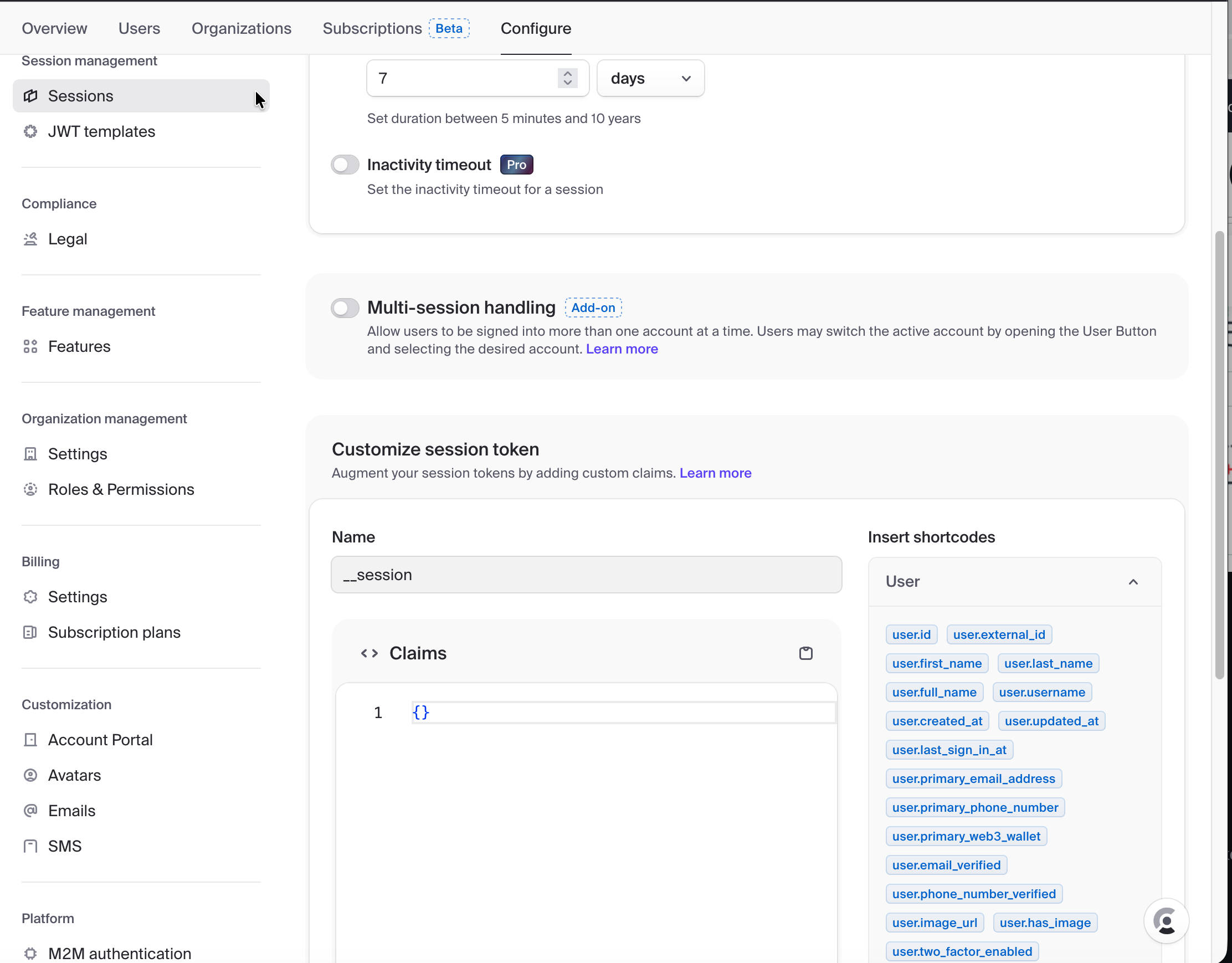 Open the Clerk dashboard and open your application. Select the Configure section, and find Sessions under Session Management on the right.