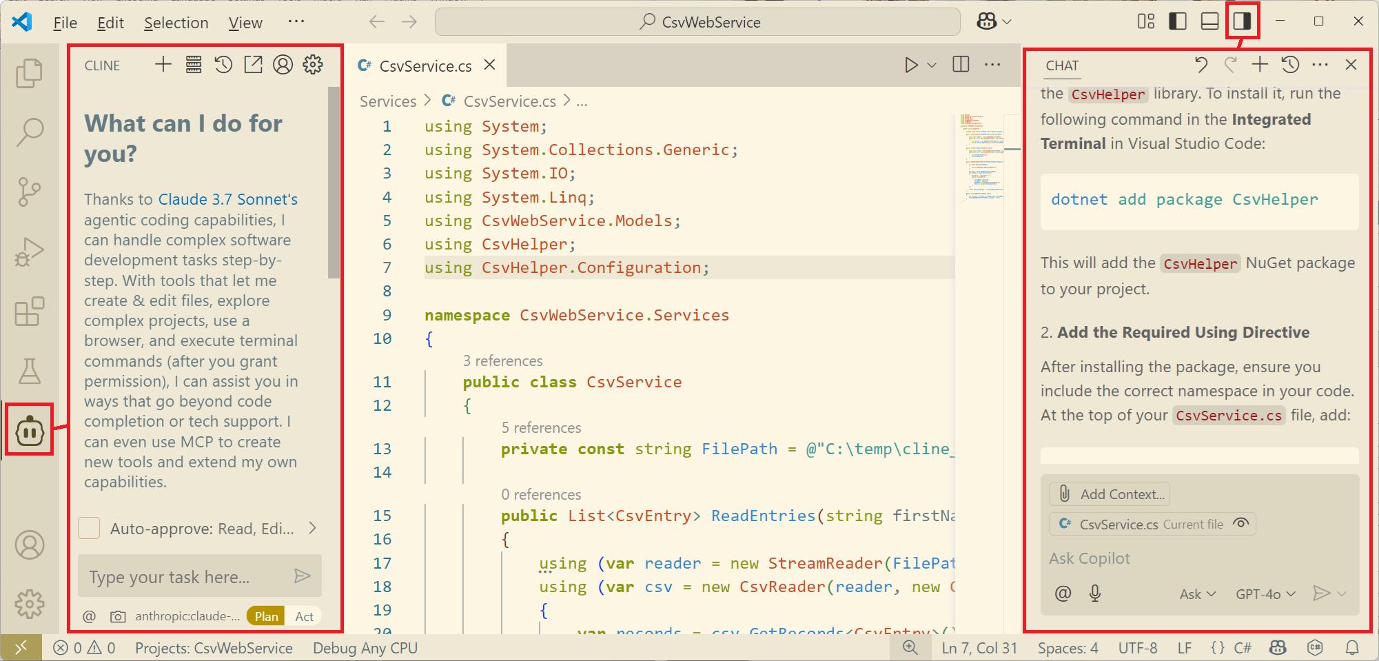 Cline is an extension with the prompts appearing on the left as shown in the screenshot below, while Copilot, although also an extension, appears in the sidebar on the right.