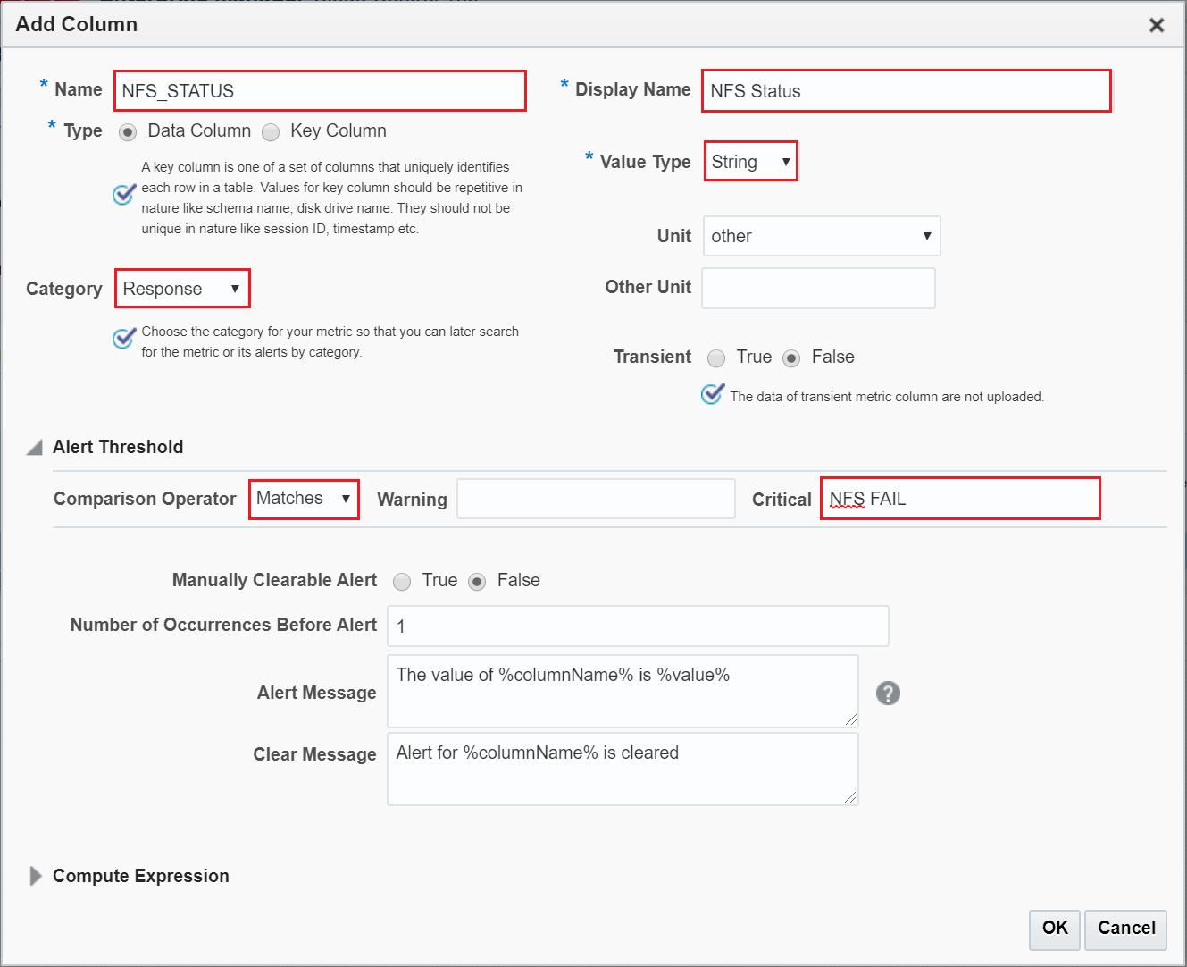 8. Provide a column name, and fill out the relevant information. Add the alert threshold. This will determine the condition on which a Warning or Critical alert will be sent.