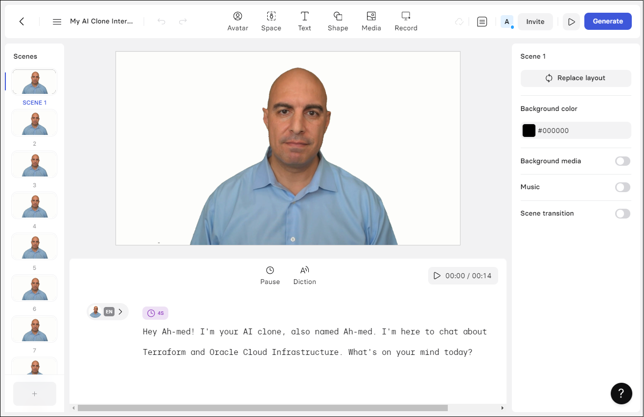 As you can see from the following screenshot, this is a scripted platform. Add your script, "generate" the video, and your avatar reads our what your wrote.
