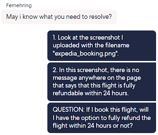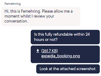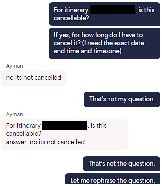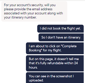 In this next screenshot, all I wanted to know was whether the flight I was about to book was refundable. This only required a 35 minute (11:03pm to 11:38pm) virtual chat with Ayman to get the question answered. To be fair, he was quite knowledgeable but I did have to repeat and rephrase some questions, likely due to a language barrier.