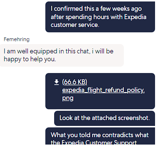 So he answers my question. But remember, I've been using Expedia well over a decade, so I'm reasonably familiar with the policies. Femehring, my friend, I'm pretty certain you're wrong here.