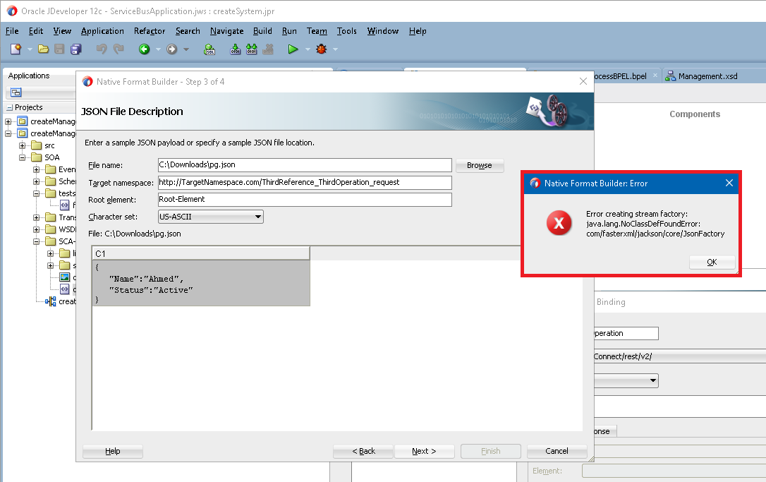 Getting java.lang.NoClassDefFoundError in JDeveloper Native Format Builder for JSON