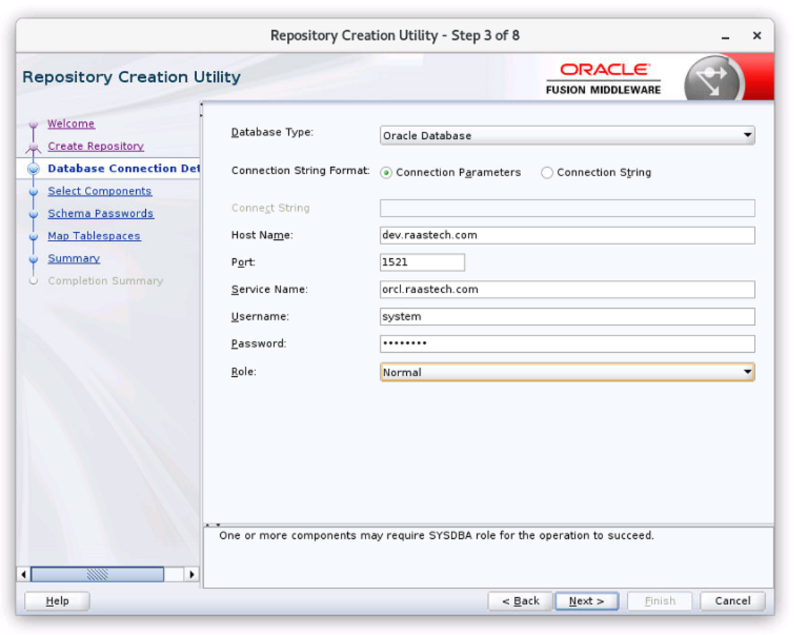 Depending on the Oracle Fusion Middleware components being installed, you will need to use the "SYSDBA" role and not the "Normal" role.