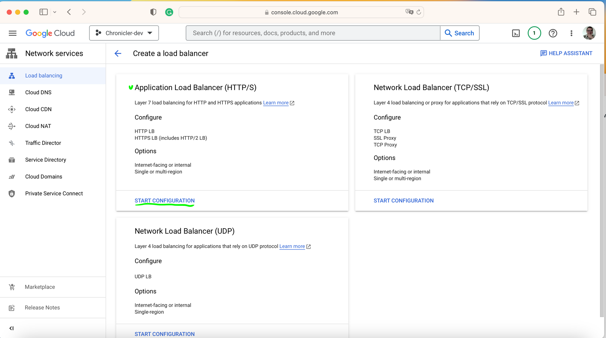The first puzzle you should solve - is where the load balancer is. You may think it's under the VPC Networks section, but it is not. You may not even find it without the console search. Start typing "load bal.." and you find the whole class of products - Network Services. Here, under the Load Balancing section, click the "+ CREATE LOAD BALANCER" link to start the configuration wizard.