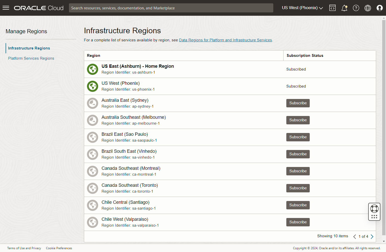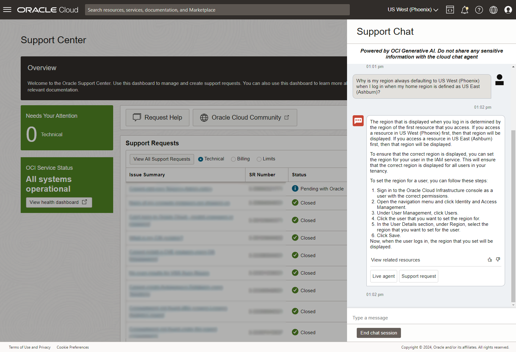 When I log in to the OCI console, the region on the top bar is always defaulting to "US West (Phoenix)". We have no resources in that region.