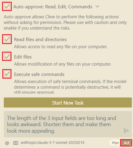 But I don't know where this data is stored and I don't like how long the input fields look. Let's ask Cline to make some updates.