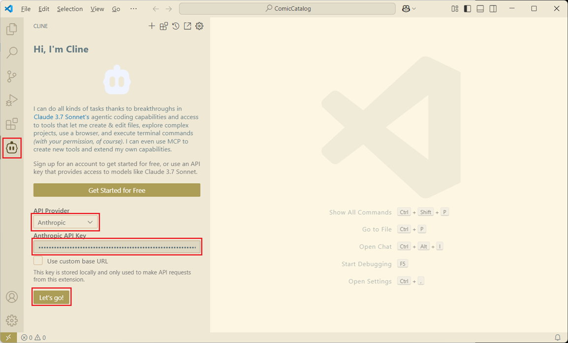 Configuring Cline simply involves selecting your LLM and entering your API key. Based on what I read from others online, Anthropic seems to work preferably well with Cline.