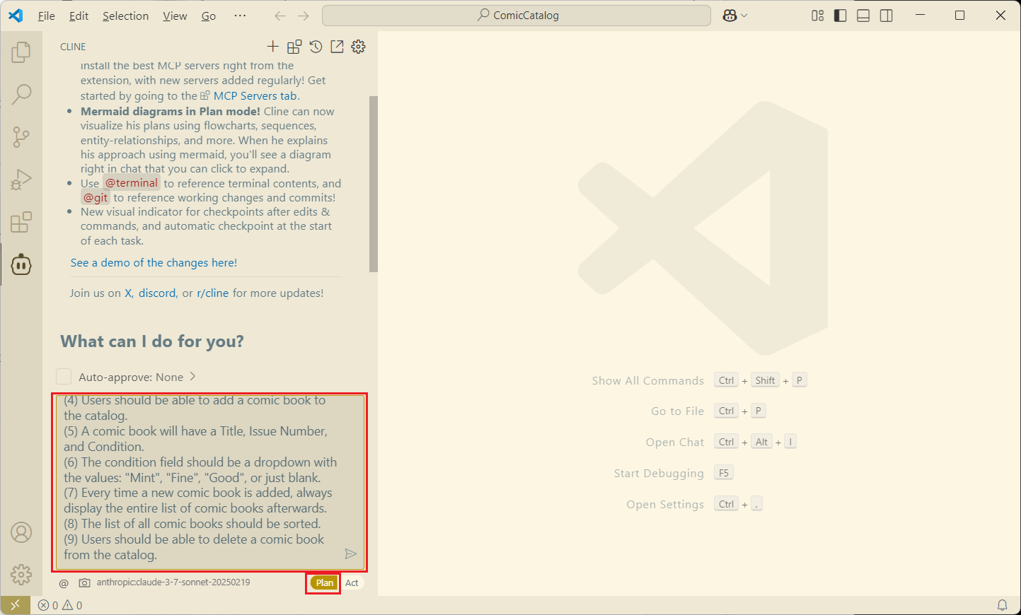Cline has a Plan phase and an Act phase. The Plan phase will allow the engine to collaborate with you on a plan and will not write code. This allows for thoughtful planning as you continually tweak it instead of spending hours editing prompts to get it perfect.