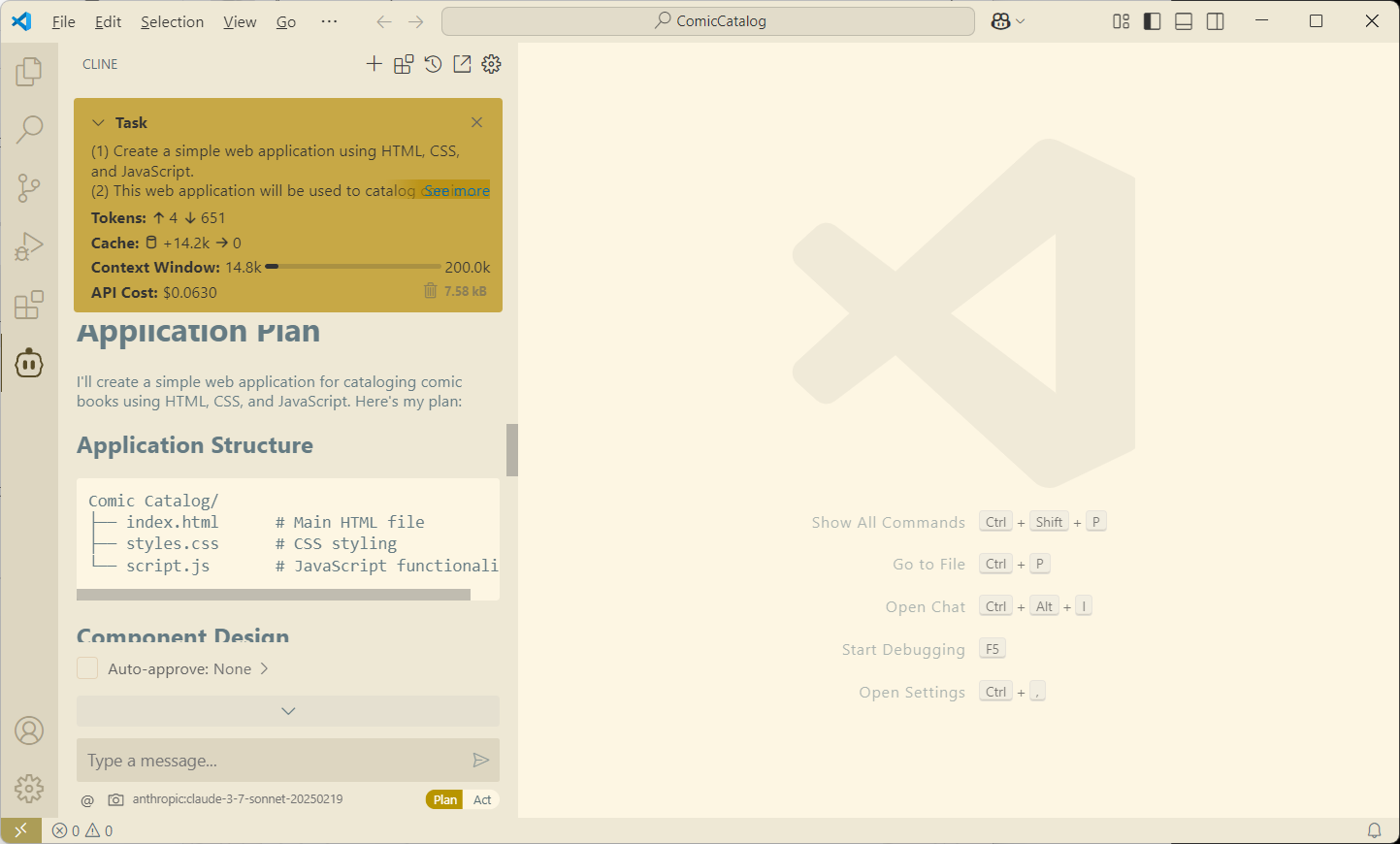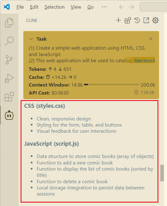 Granted this is a low complexity code generation example, my initial reactions with Cline are nonetheless positive. I have yet to use it to create medium or high complexity code.