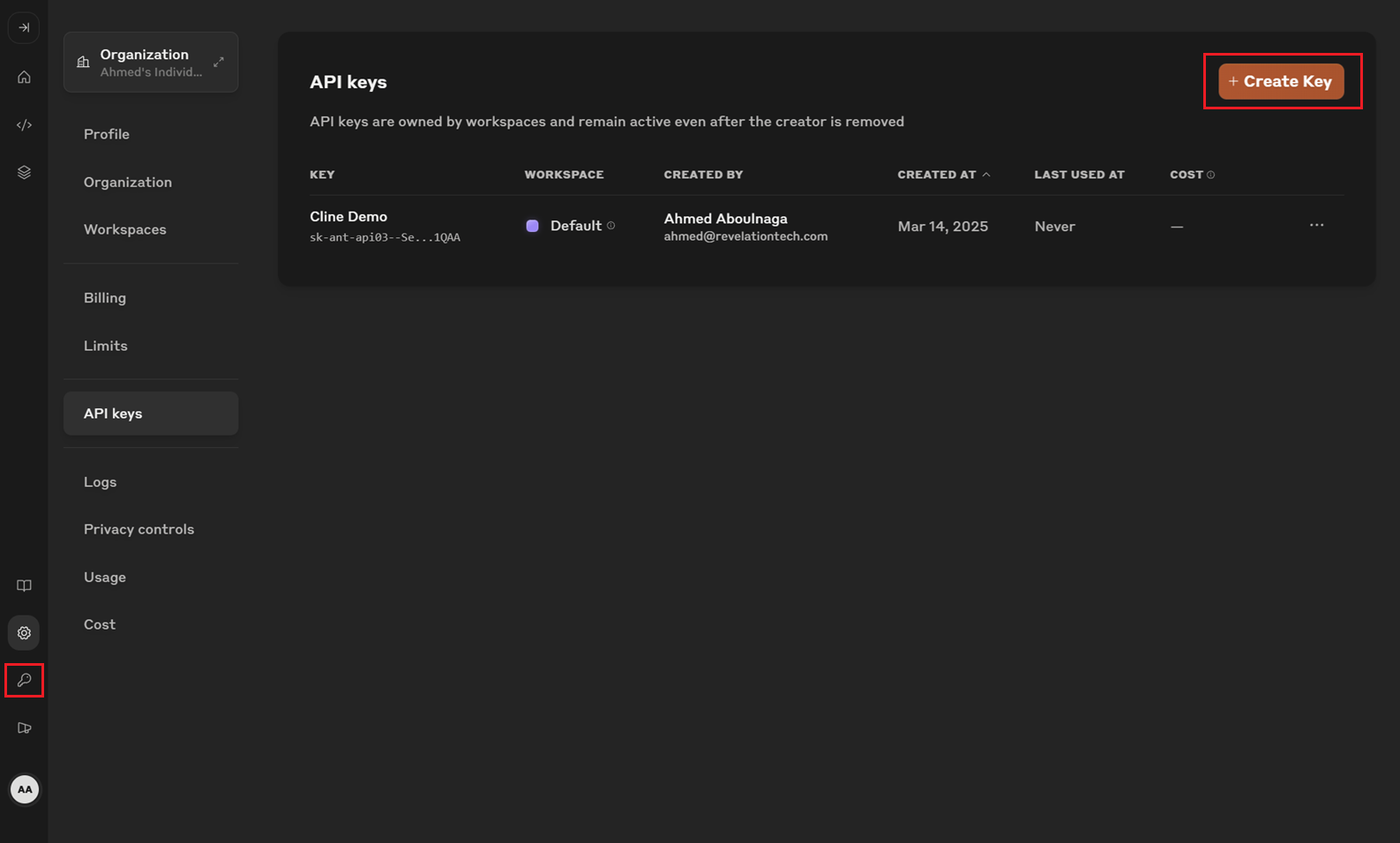 - Copy the key value and keep it handy. This will be needed later during the Cline configuration.