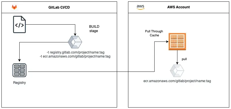 I have a cloud-agnostic Python app that can be deployed to various platforms, including AWS. The source code resides in the GitLab private repo, and it's only natural to use the project's container repository as a single source of the code. A simple diagram is often more effective than a lengthy description of the image's building and flow.