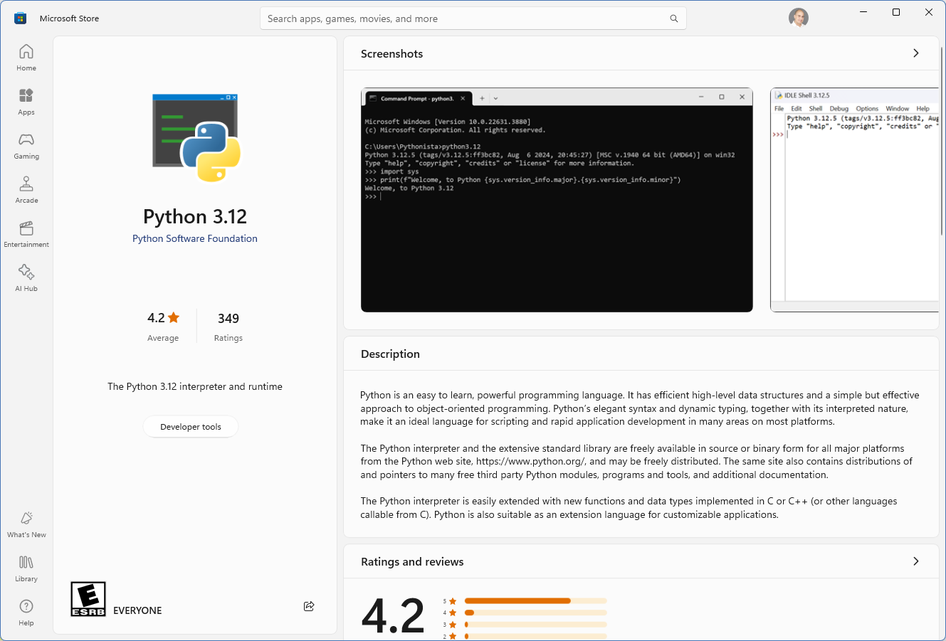 This automatically popped up the Microsoft Store app and I installed the Python 3.12 software.