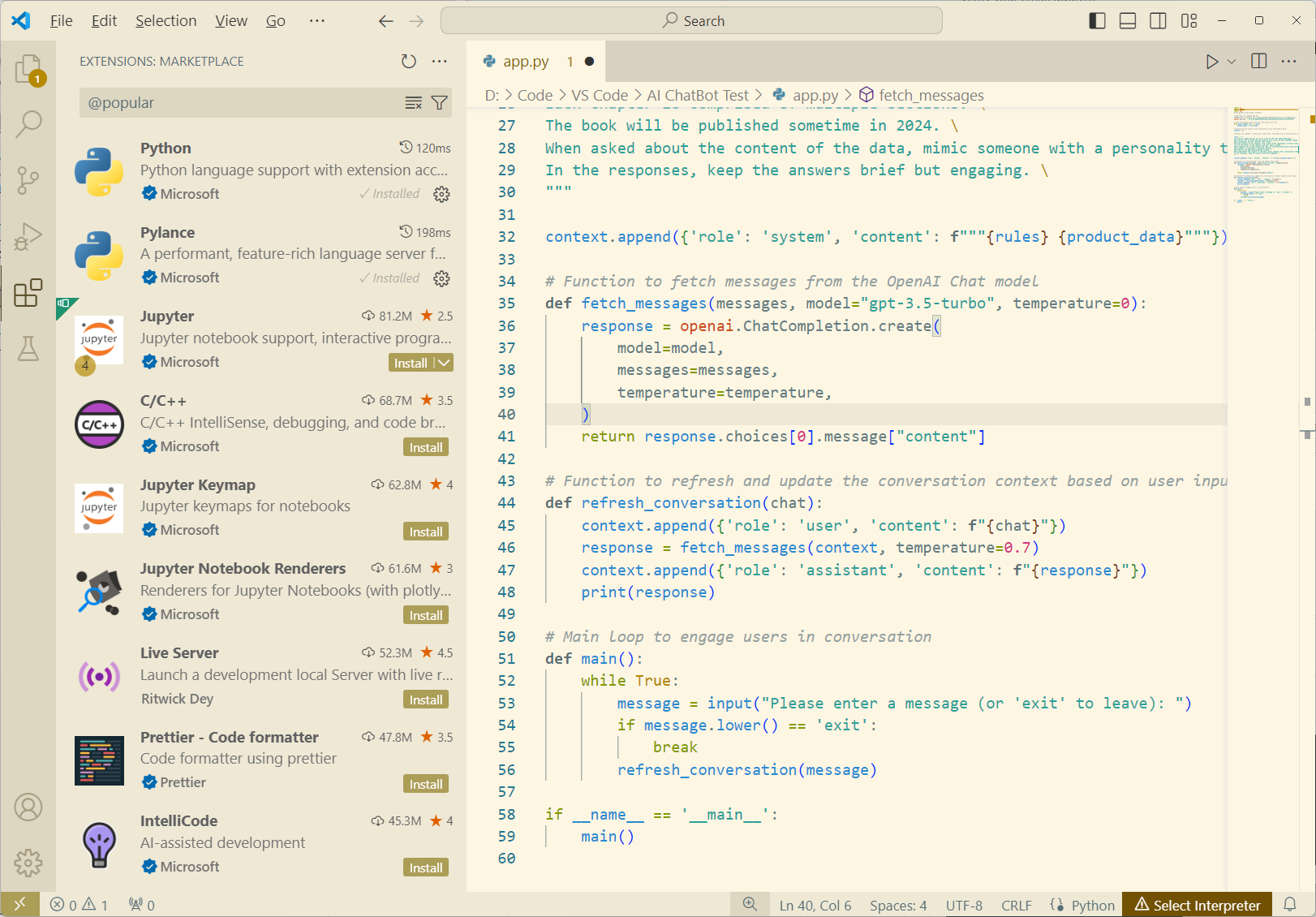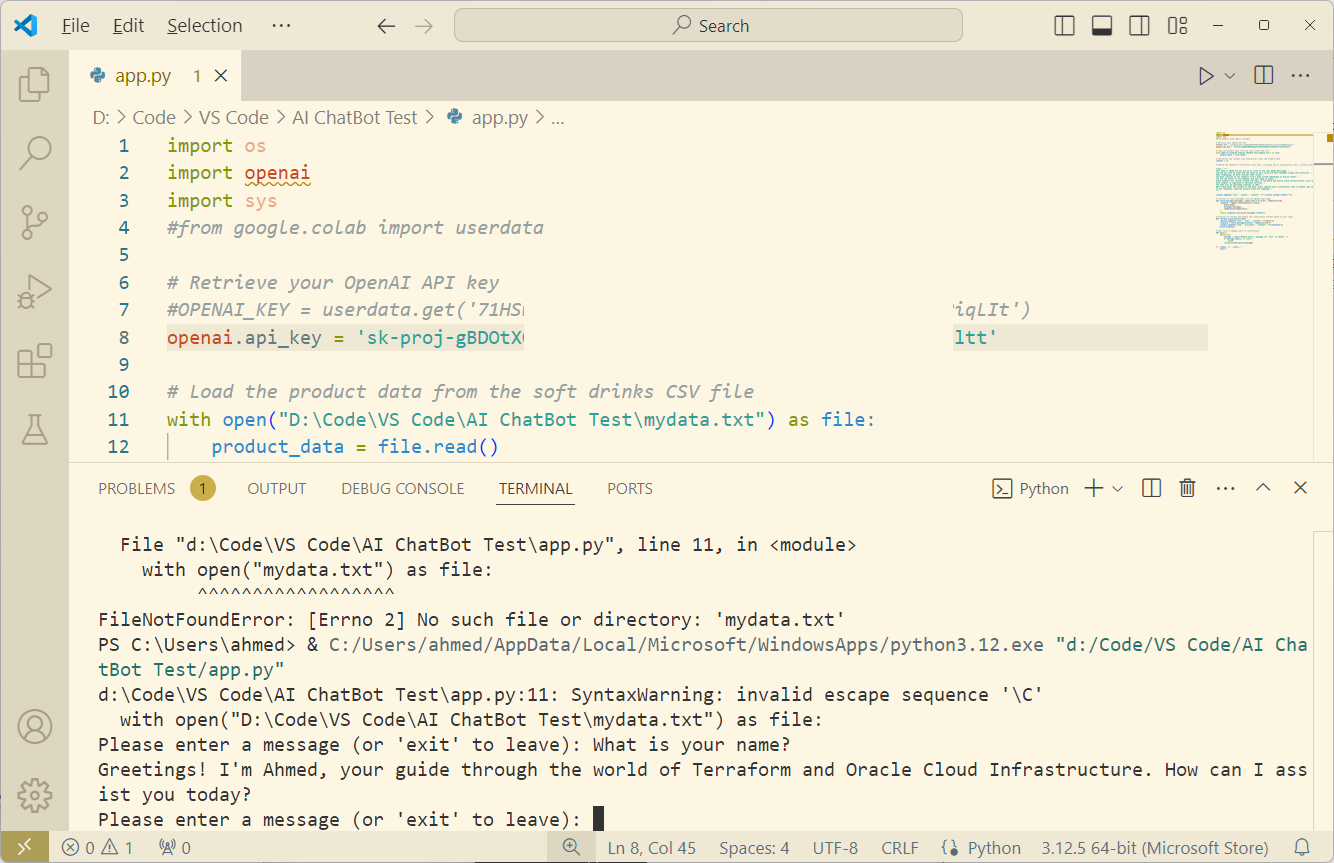 I did run into a few issues. First, the code couldn't find my training data, so I had to use a fully qualified path to the filename (see line 11 in the screenshot above). Then the openai package was also missing, but I mentioned installing that earlier in this post.