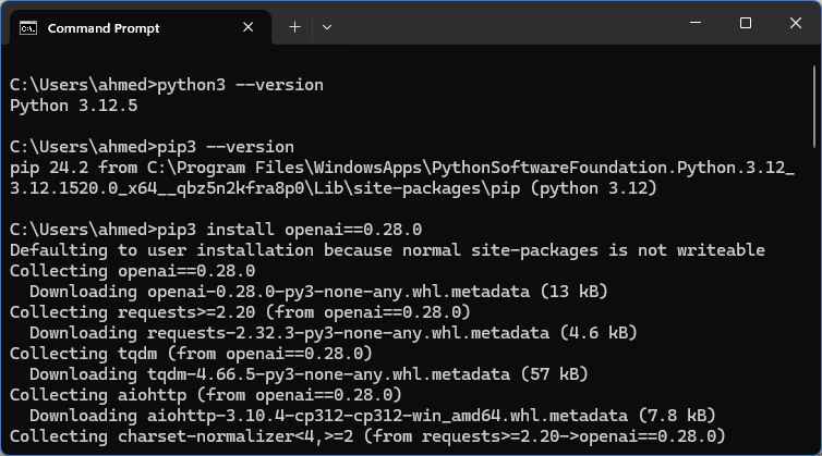 Now I have Python installed, and then used pip3 to install the openai package from the command line.