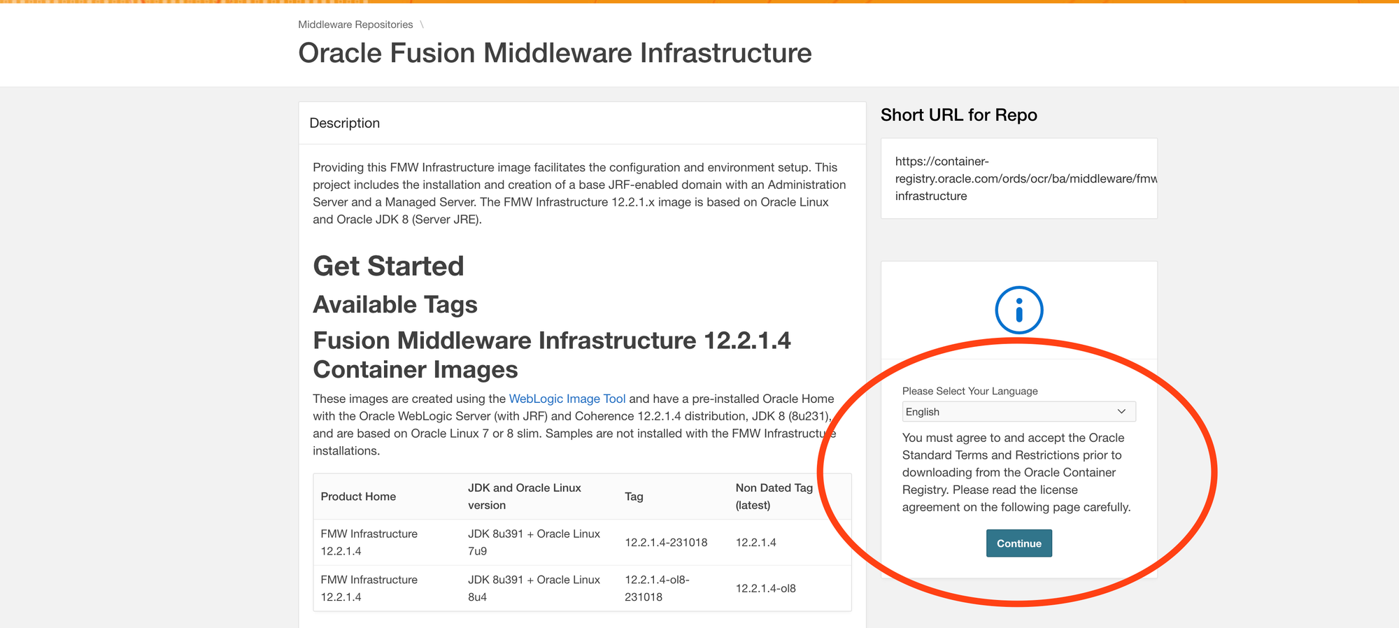 - Open Oracle Container Registry URL https://container-registry.oracle.com/
