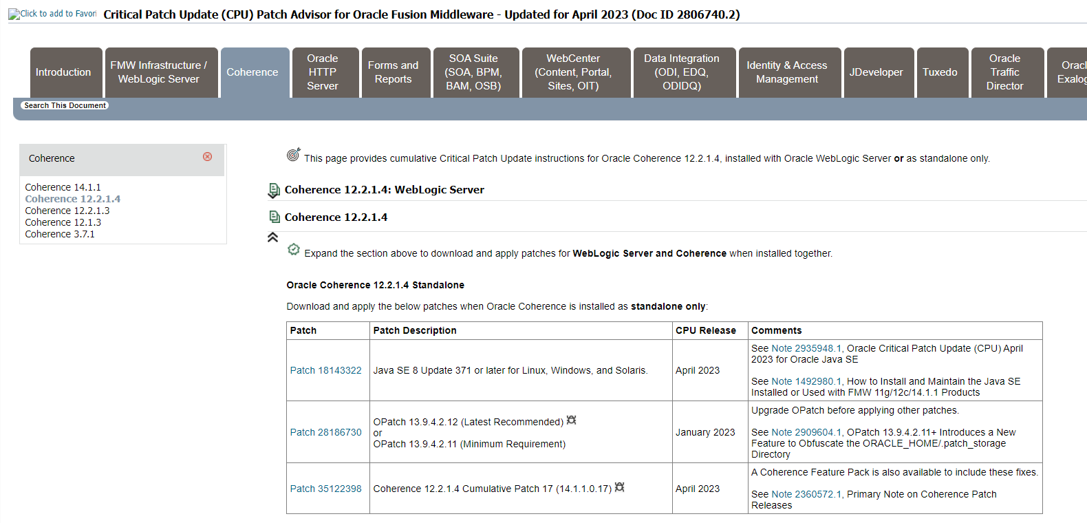 - Navigate to Oracle Support and download the Oracle Coherence patch number 35122398 and the latest OPatch patch number 28186730.