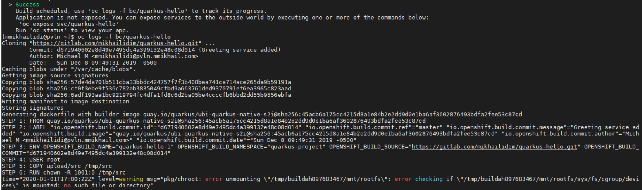 $ oc new-app quay.io/quarkus/ubi-quarkus-native-s2i:19.2.1~https://gitlab.com/mikhailidim/quarkus-hello.git \