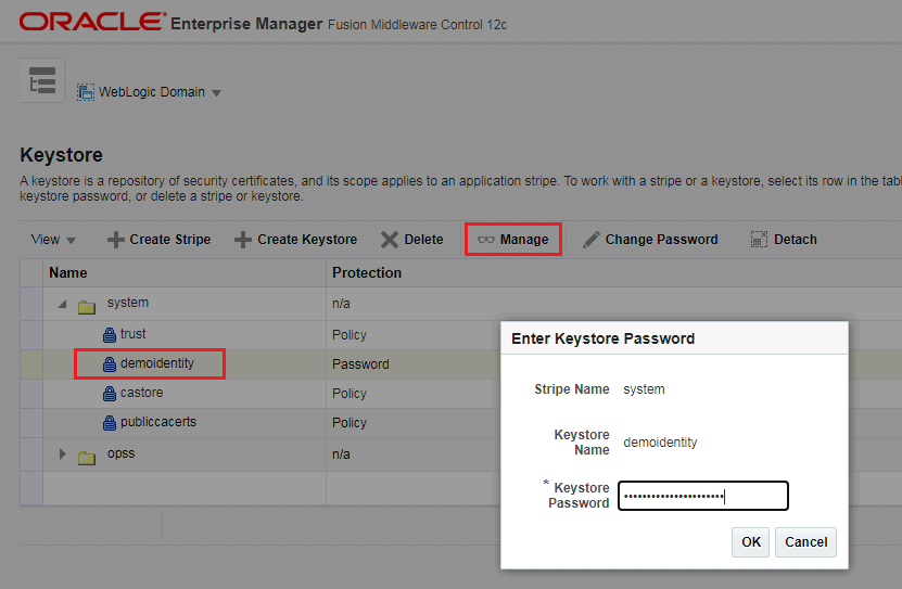 Highlight the demoidentity keystore row and click Manage, using the password DemoIdentityKeyStorePassPhrase:
