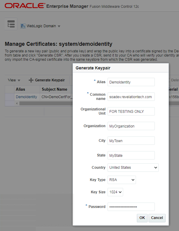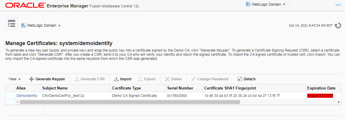 Regenerating the 'DemoIdentity' certificate in WebLogic 12c