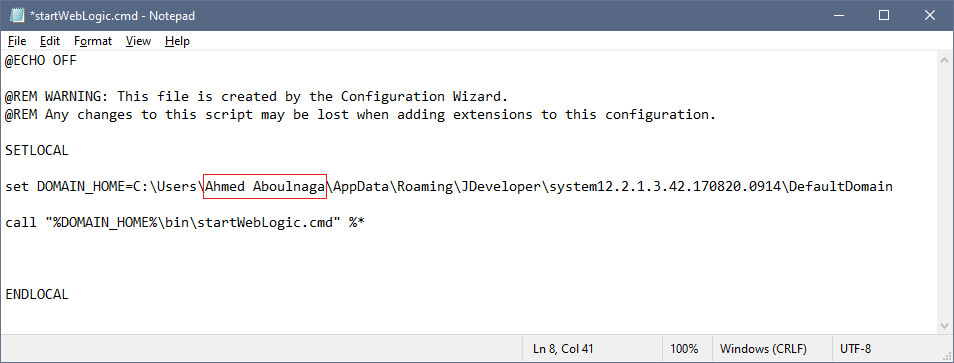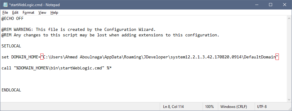 Here's an example of one of the scripts, and you can see the subfolder/user that is causing the issue in question. Note that this is only applicable to JDeveloper running on Windows-based workstations: