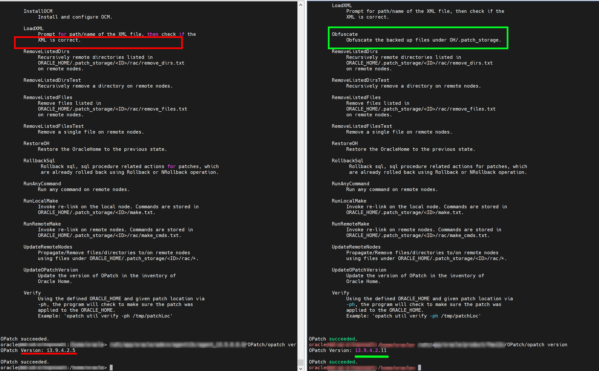 $ $ORACLE_HOME/OPatch/opatch util ObfuscateIt makes the patch storage content unrecognizable to one's eye, and all previously vulnerable libraries and files are no longer detectable as a vulnerability.