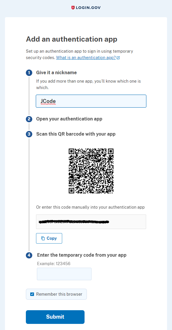 j. Paste this temporary code in the Login.gov window and click Submit.