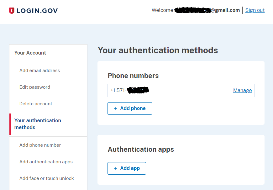 e. You will now be logged in to your Login.gov account, and on the left hand side, click Your authentication methods. You will see how a phone number has been set up, but not an authentication app.