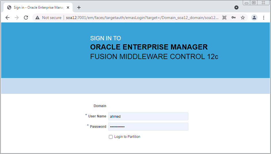 /emand press ENTER. Basically, just go to the main page athttp://soa12:7001/em.