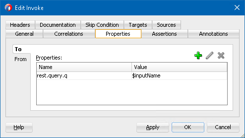 Now that the REST adapter is created, double-click on the Invoke activity in your BPEL process, navigate to the Properties tab, and manually add a property as shown. Here, the BPEL variable $inputName becomes the value that is passed to the rest.query.q property: