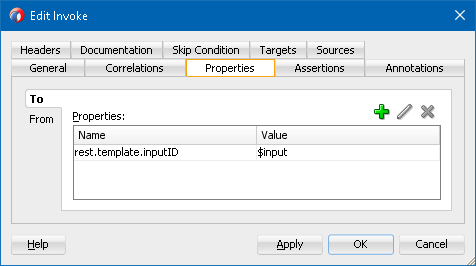 Similarly, when editing the Invoke activity in your BPEL process, simply add a property to map your BPEL variable (e.g., $input) to the runtime property (e.g., rest.template.inputID):