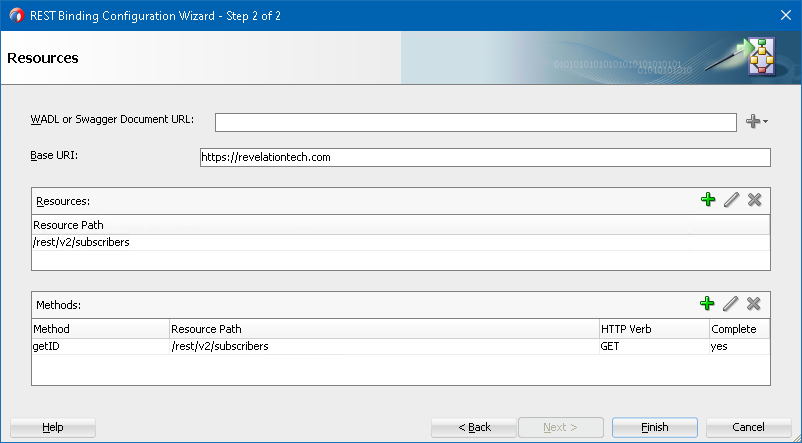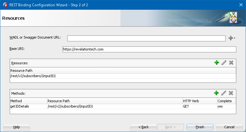 In this example, my SOA composite has 2 separate external references. These are both REST services using the GET method. The first one take the format of https://revelationtech.com/rest/v2/subscribers?q=firstname wherein an explicit query parameter q is passed in the URL with some value after it. The second reference takes the format of https://revelationtech.com/rest/v2/subscribers/Ahmed, wherein Ahmed is a parameterized part of the URL.