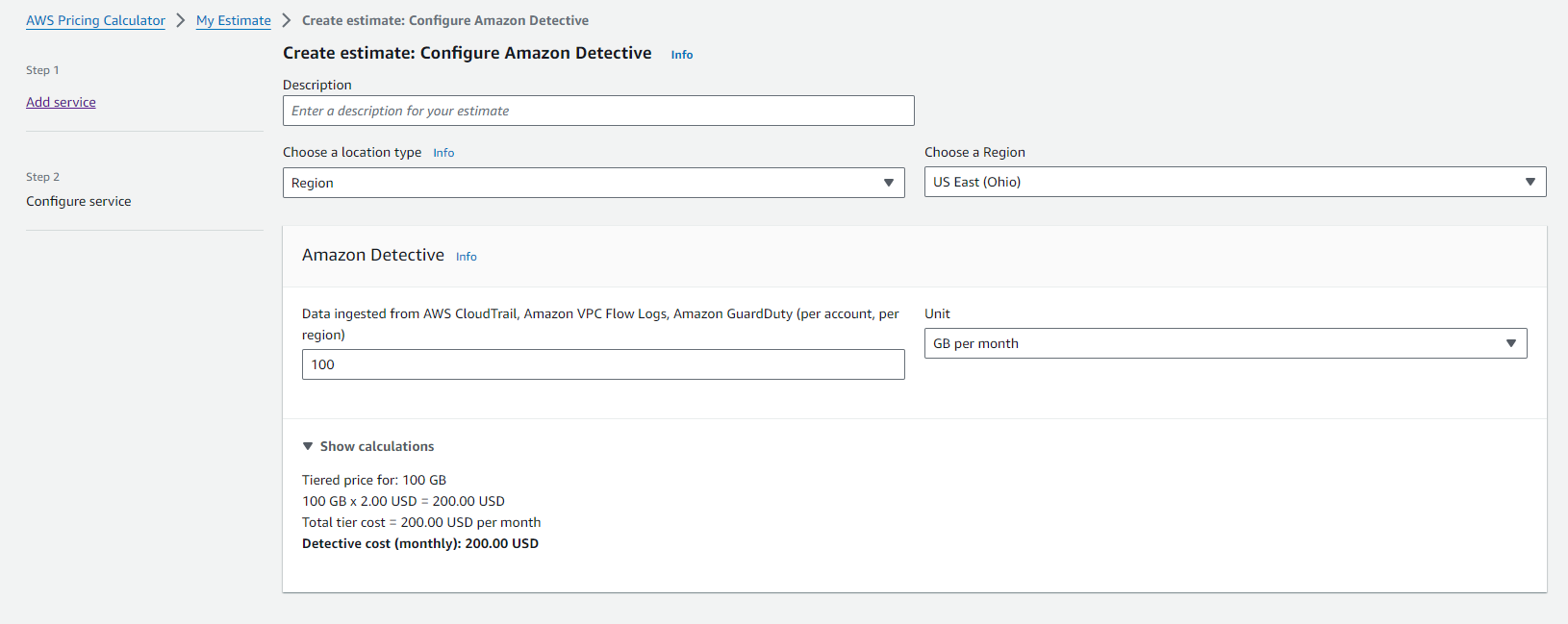 I have attached an example for the US East Region below. However, If you would like more information, you can visit the Amazon Detective pricing page.