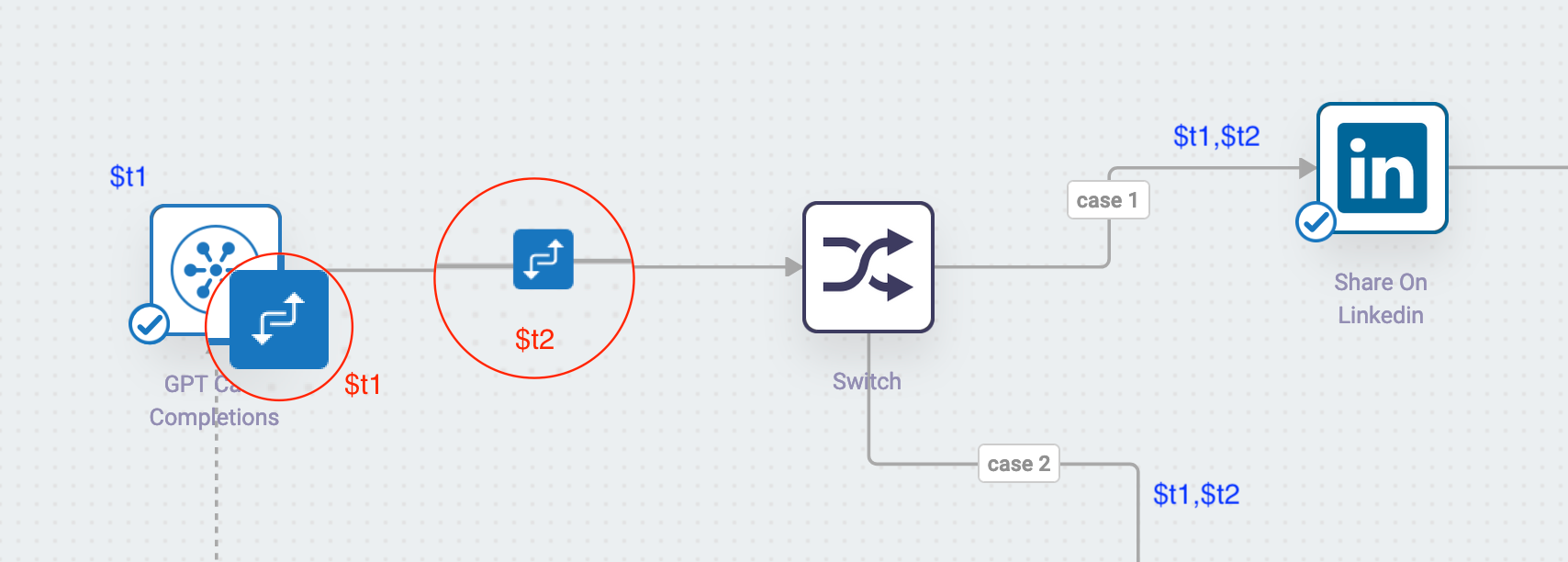 As you may see, the GPT Chat connector and the link between GPT Chat and Switch have defined connectors - red $t1 and $t2 labels on the diagram below.