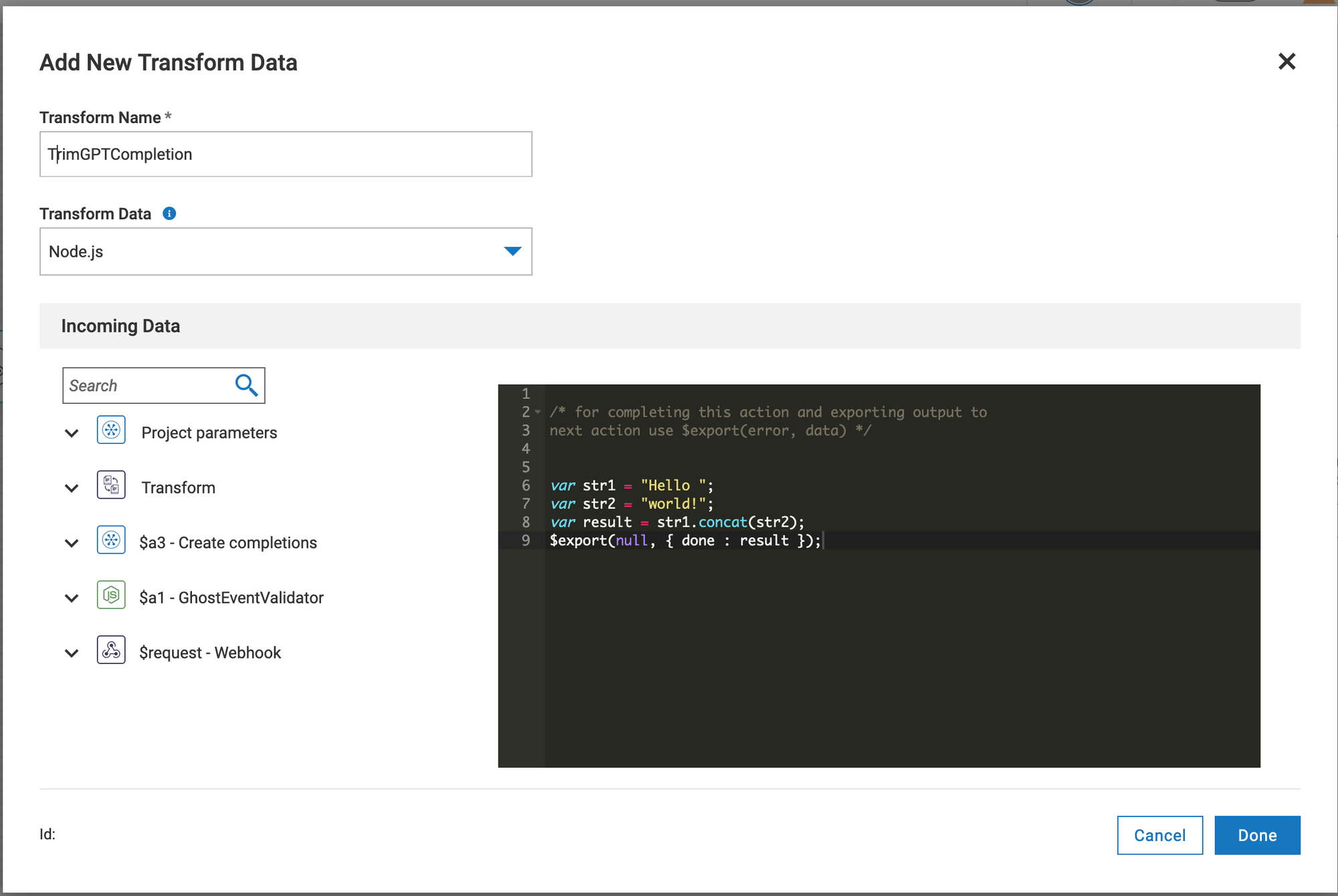 - Set the name for the new transformation (in my case, "TrimGPTCompletion") and select the type as "Custom/Node.js."