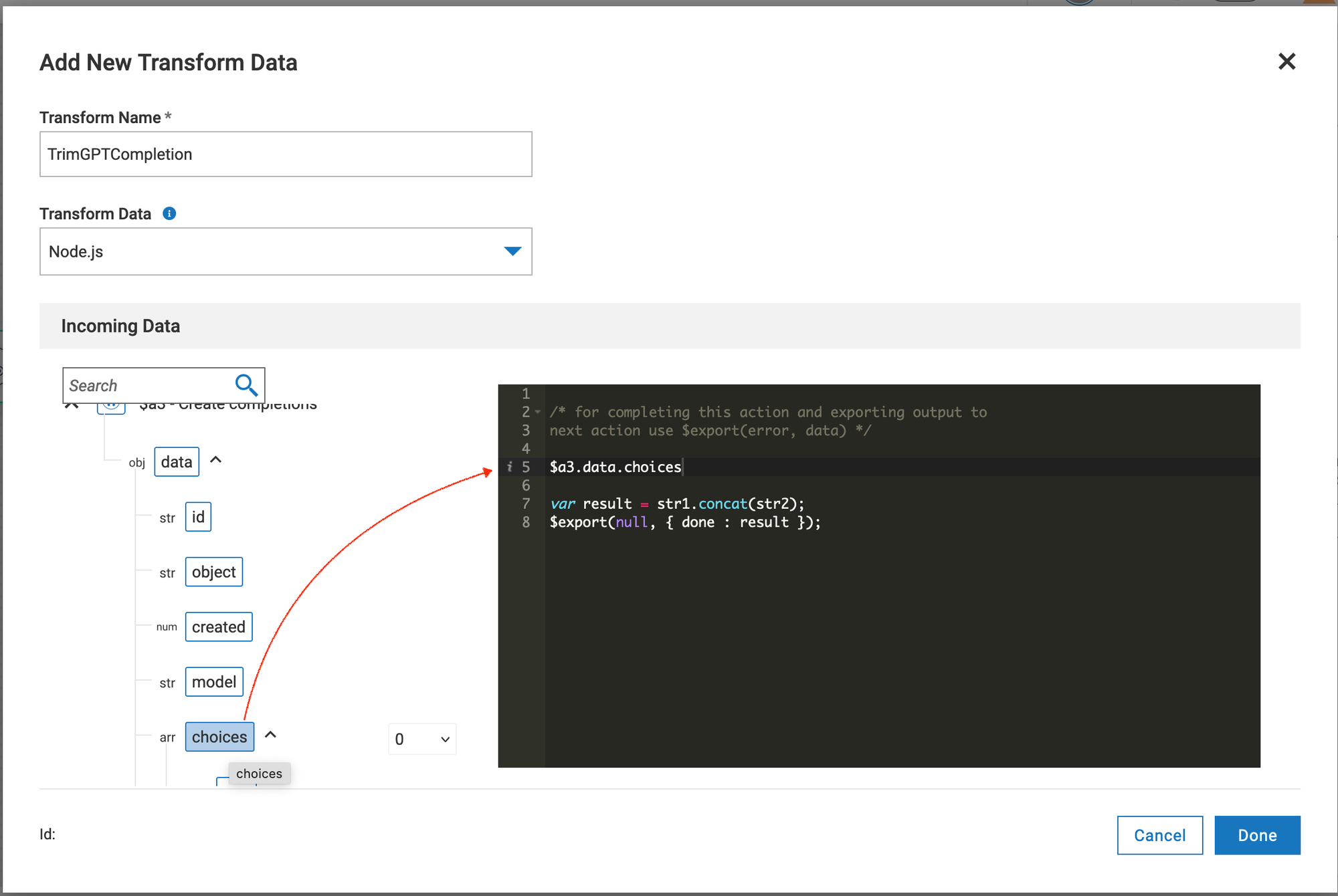 - Since that variable refers to the whole object, we export from the custom operation. Change the template text to {{$transform.t1.output.done[0]}}. This way, we address the first list item of the output attribute "done."