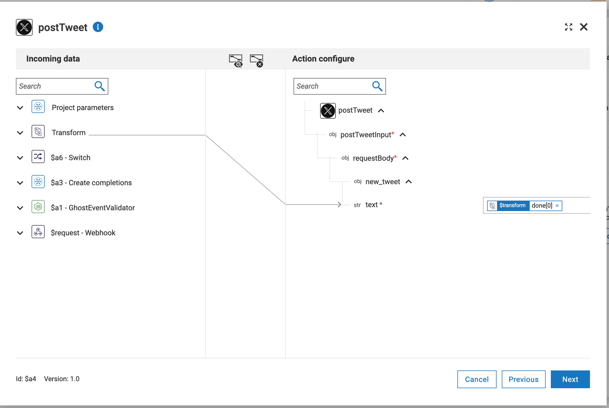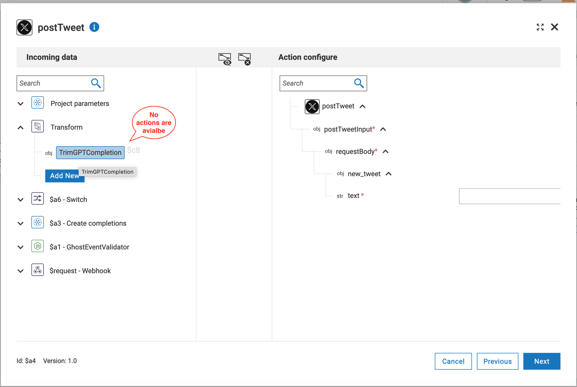 - Drag TrimGPTCompletion to the "text" field of the X connector. The input template should be similar to {{$transform.t1}}.