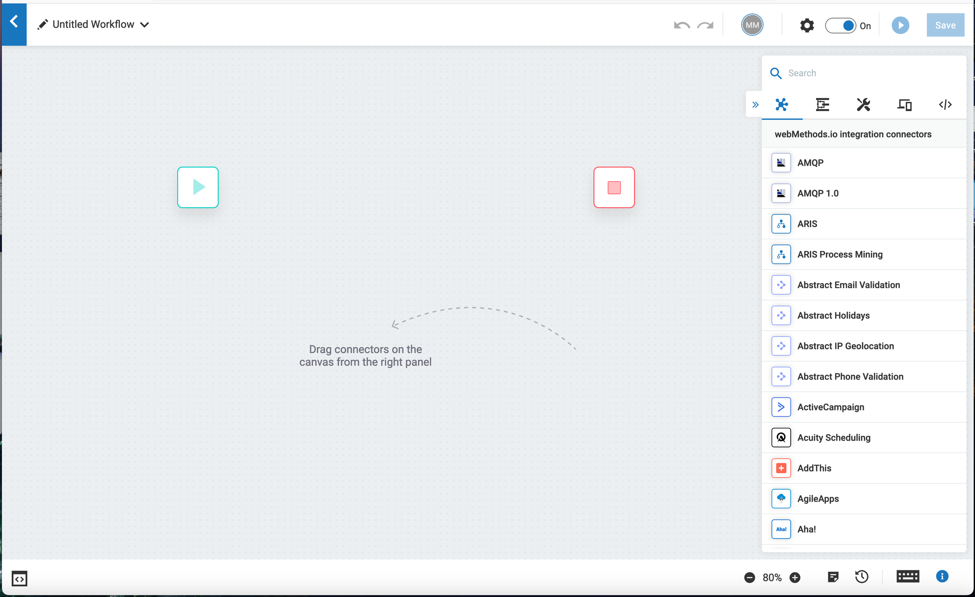 Use the connectors palette's search field to find "Set Workflow Status Failed." Drag it to the canvas between the GhostEventValidator and "Stop" tasks. The new step will automatically link to your open task.