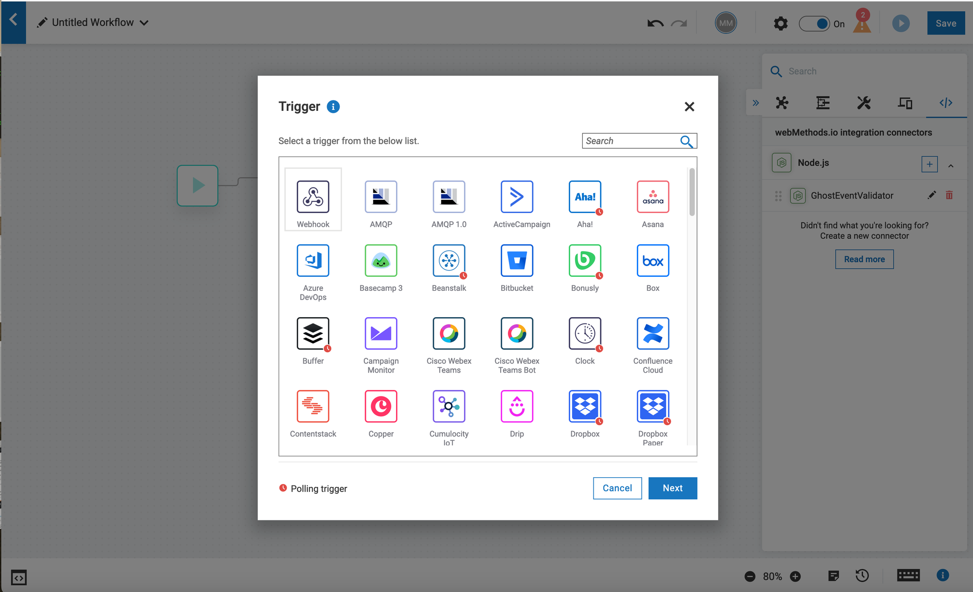 To do so, Hover the mouse pointer over the start icon and then click the ⛭ icon. Webmthodws.io offers over a hundred events to catch or pool. Luckily, what we need is the very first one — a Webhook.